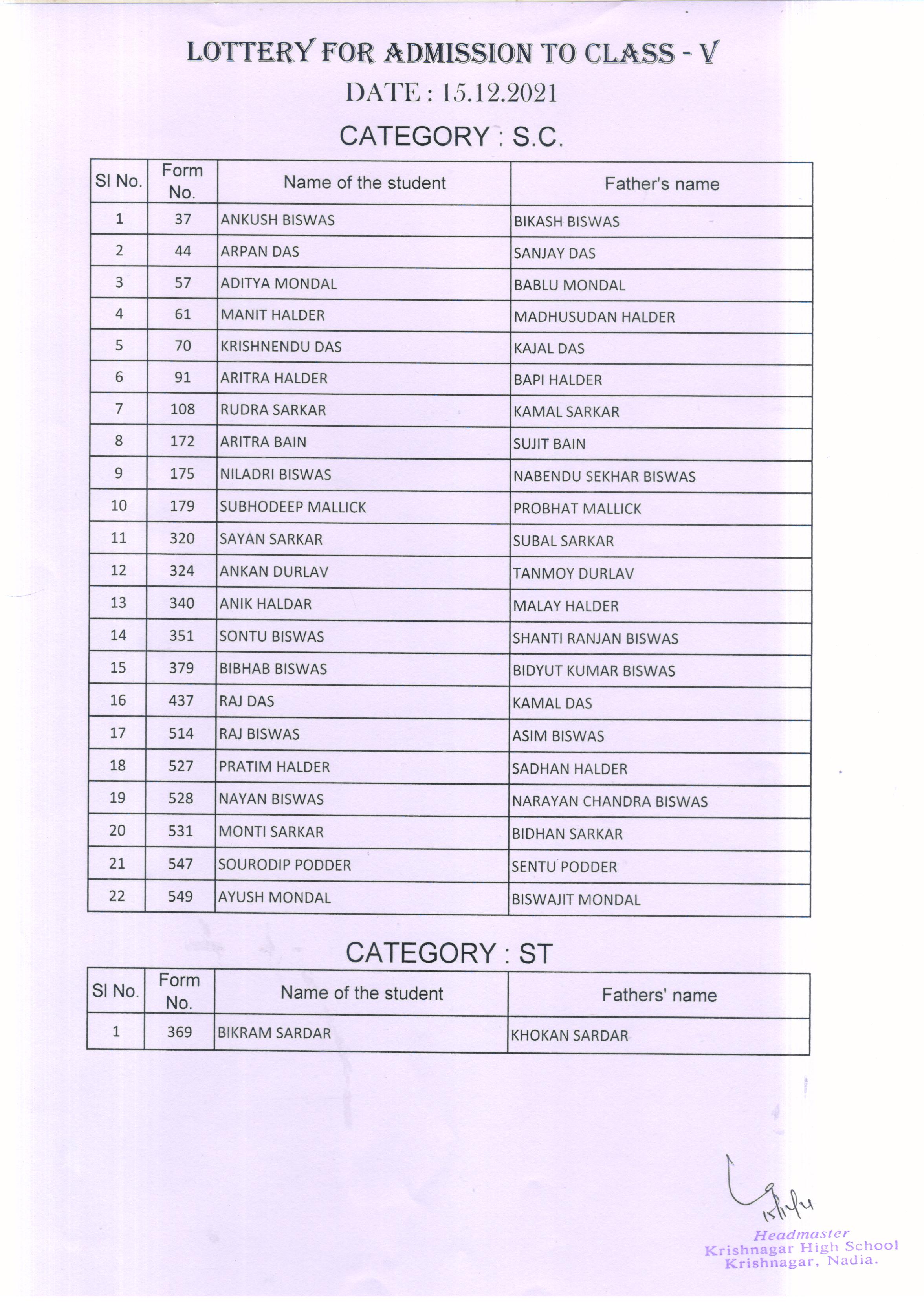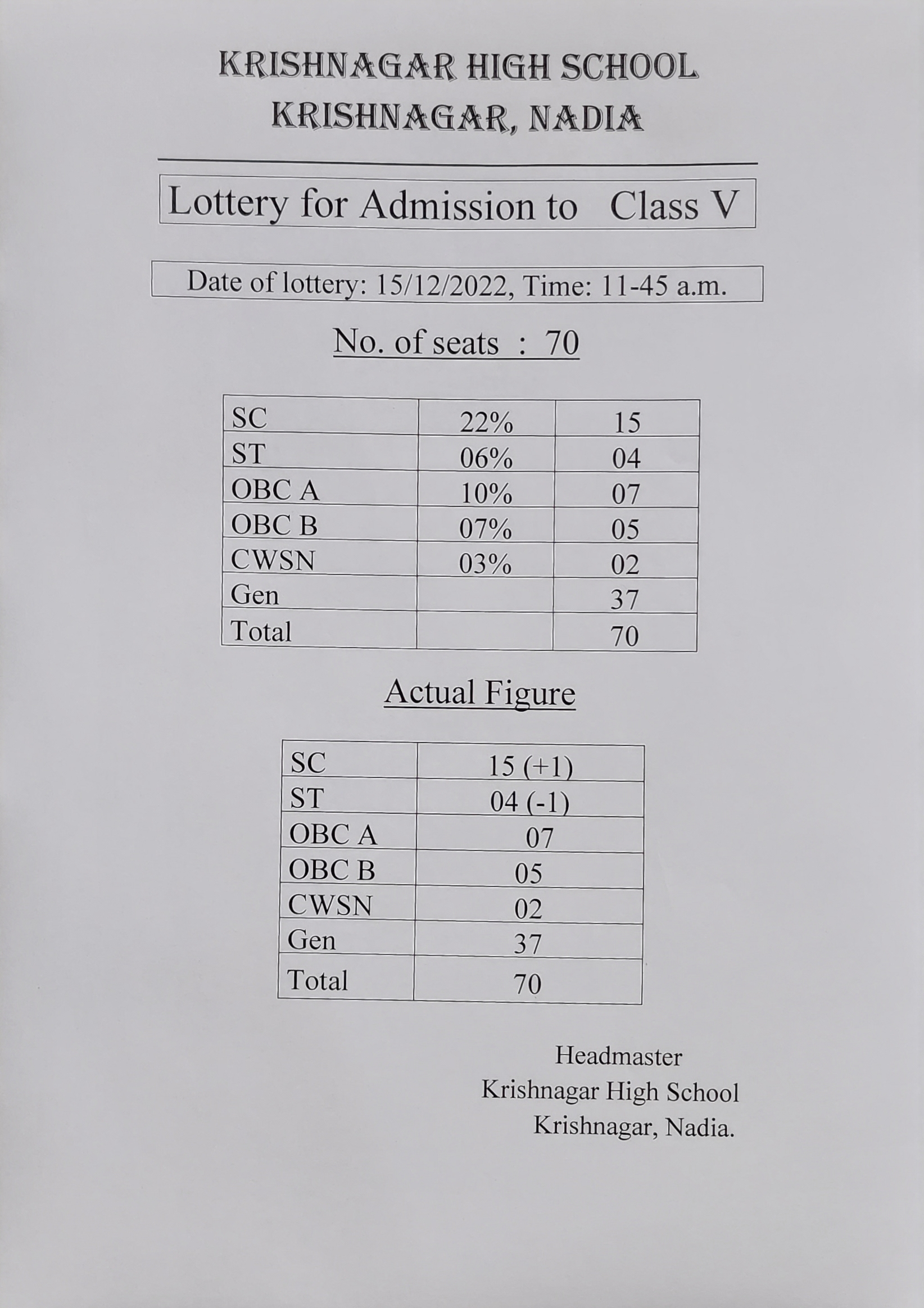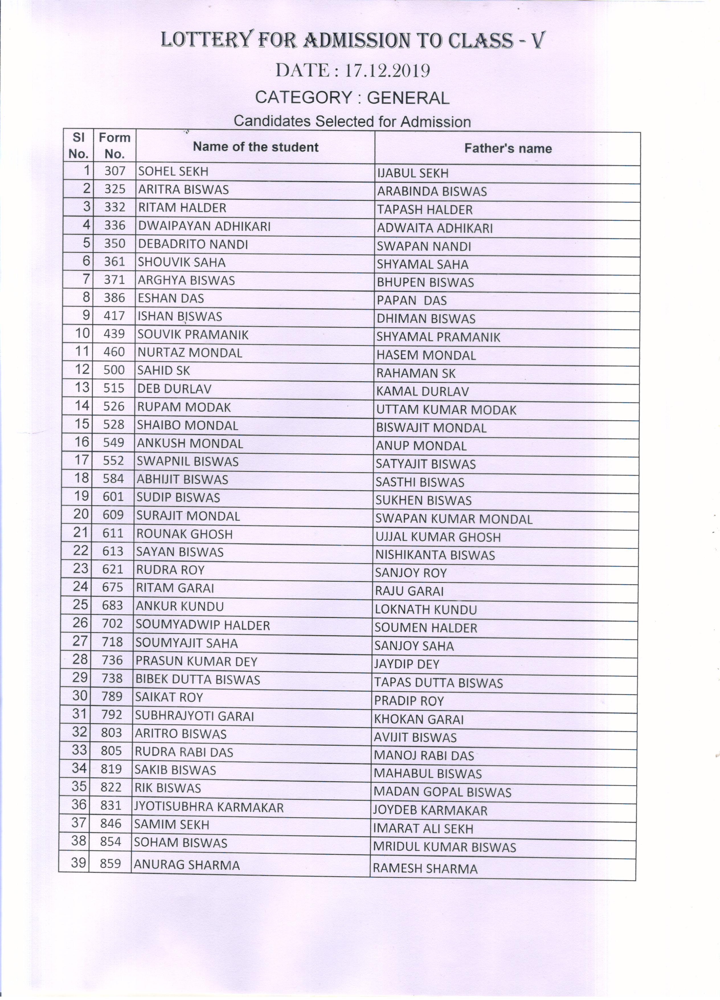 | 111 | 12/17/2019 | LOTTERY FOR ADMISSION TO CLASS V - General Category |