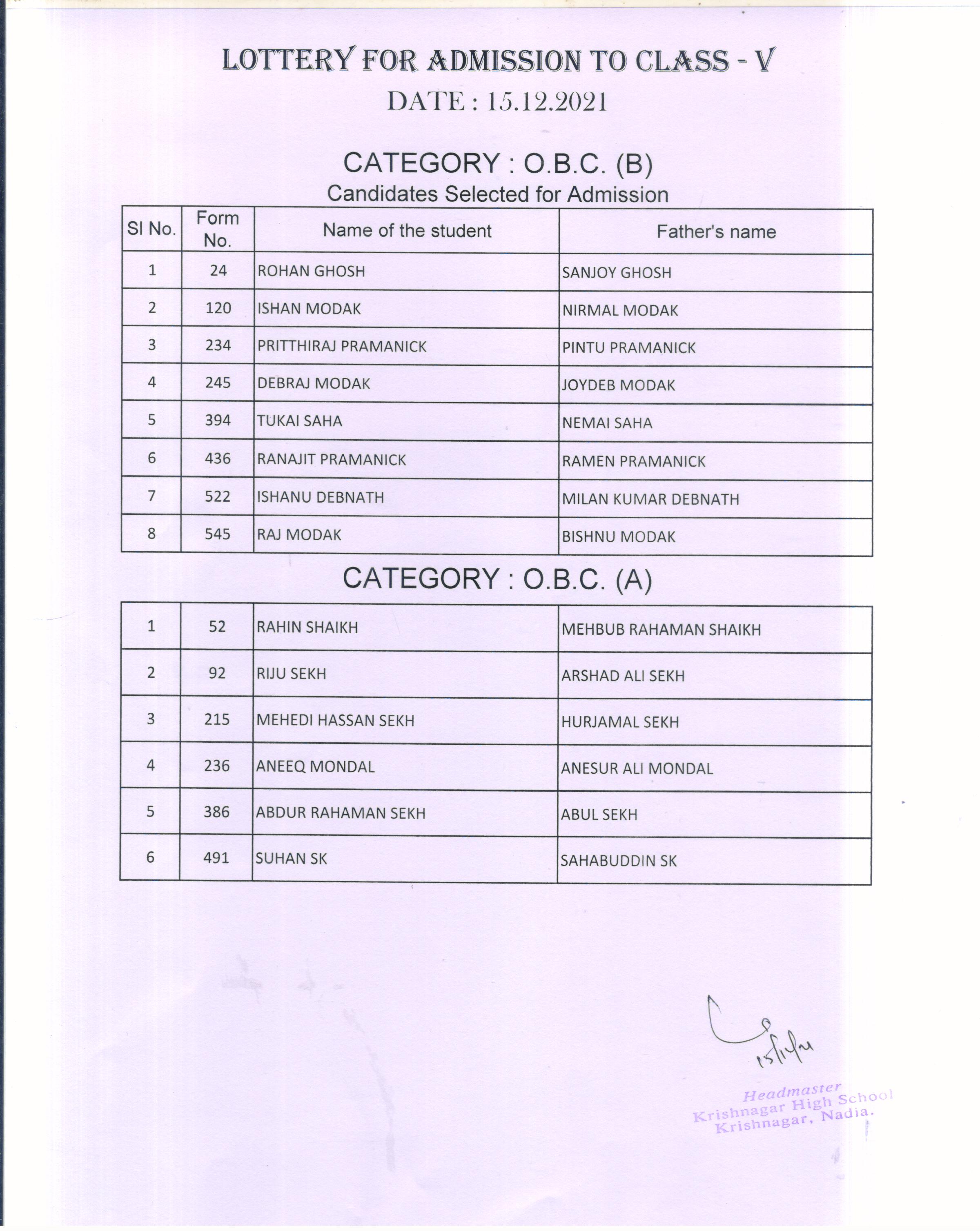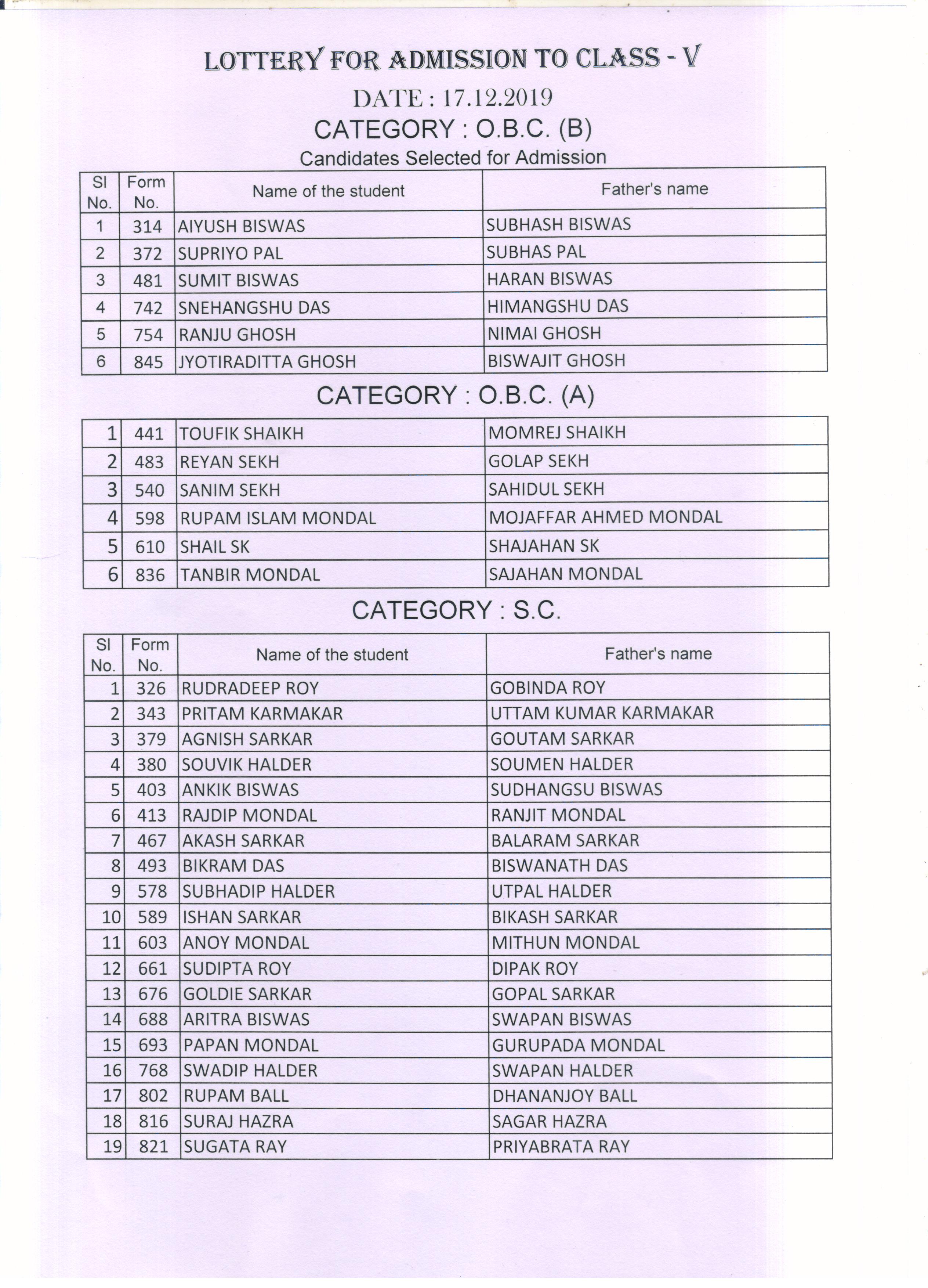 | 110 | 12/17/2019 | LOTTERY FOR ADMISSION TO CLASS V - OBC - A, OBC - A, SC Category |